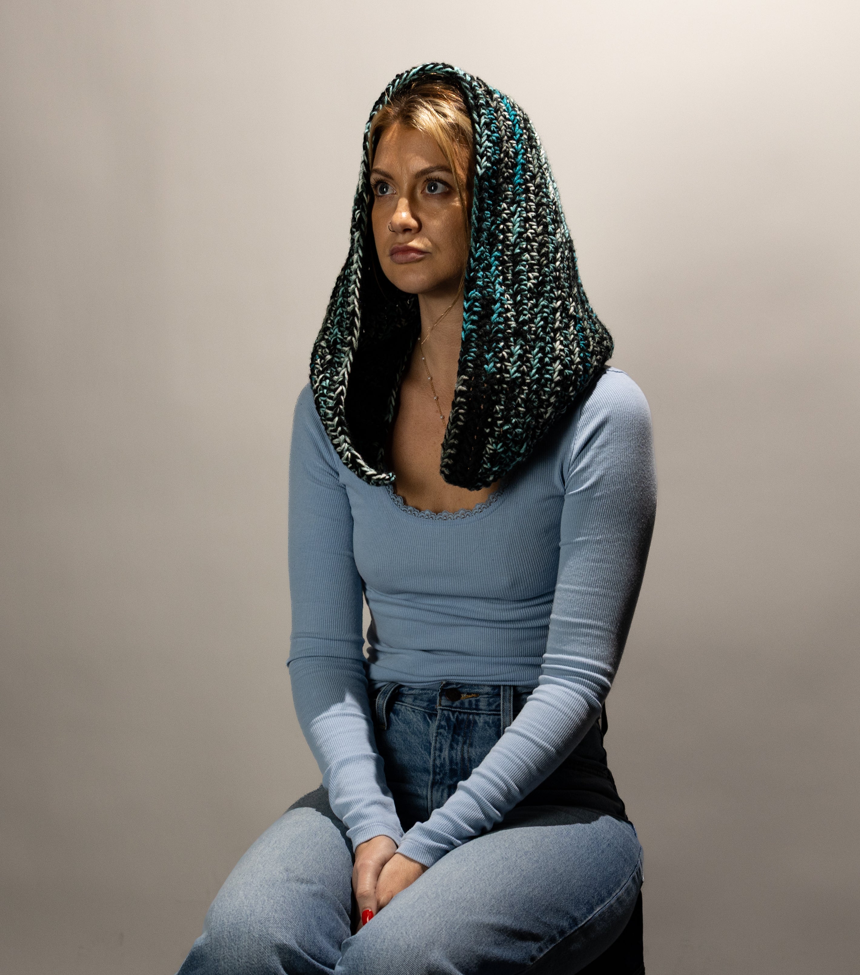 Blue & black crocheted hood