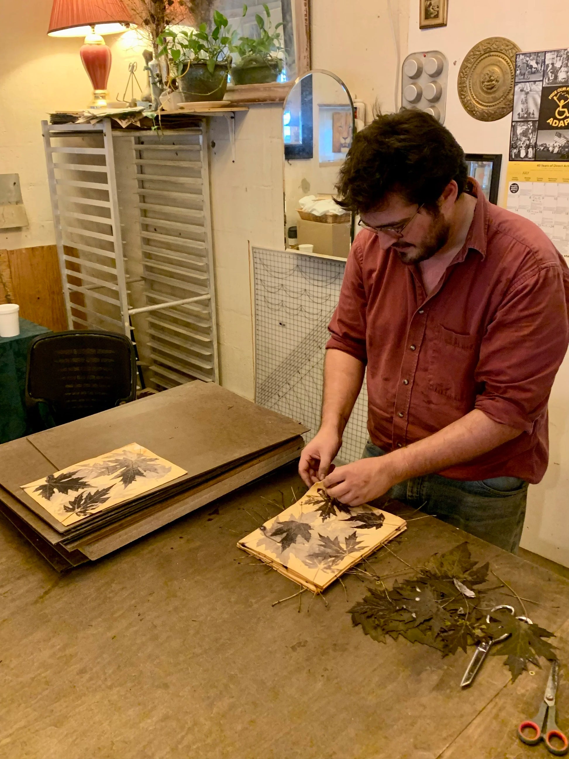Jonah’s work is deeply informed by his self-taught background and years of experimentation. His process blends traditional bookbinding techniques with a commitment to sustainability. Many materials are repurposed or locally sourced whenever possible, giving each piece a sense of history and intention.