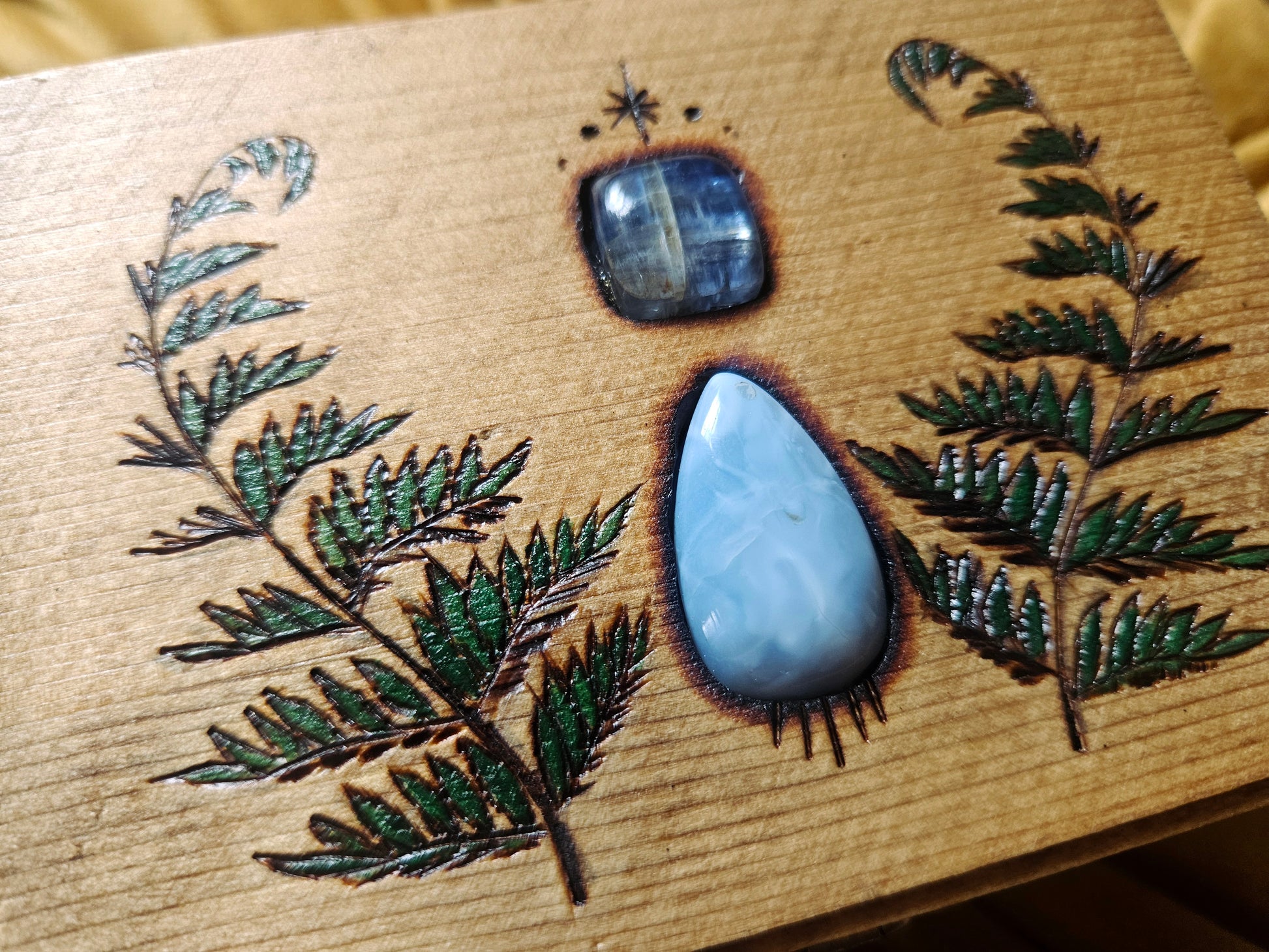 Medium: Hand-burned wood, inlaid with gemstones/stones