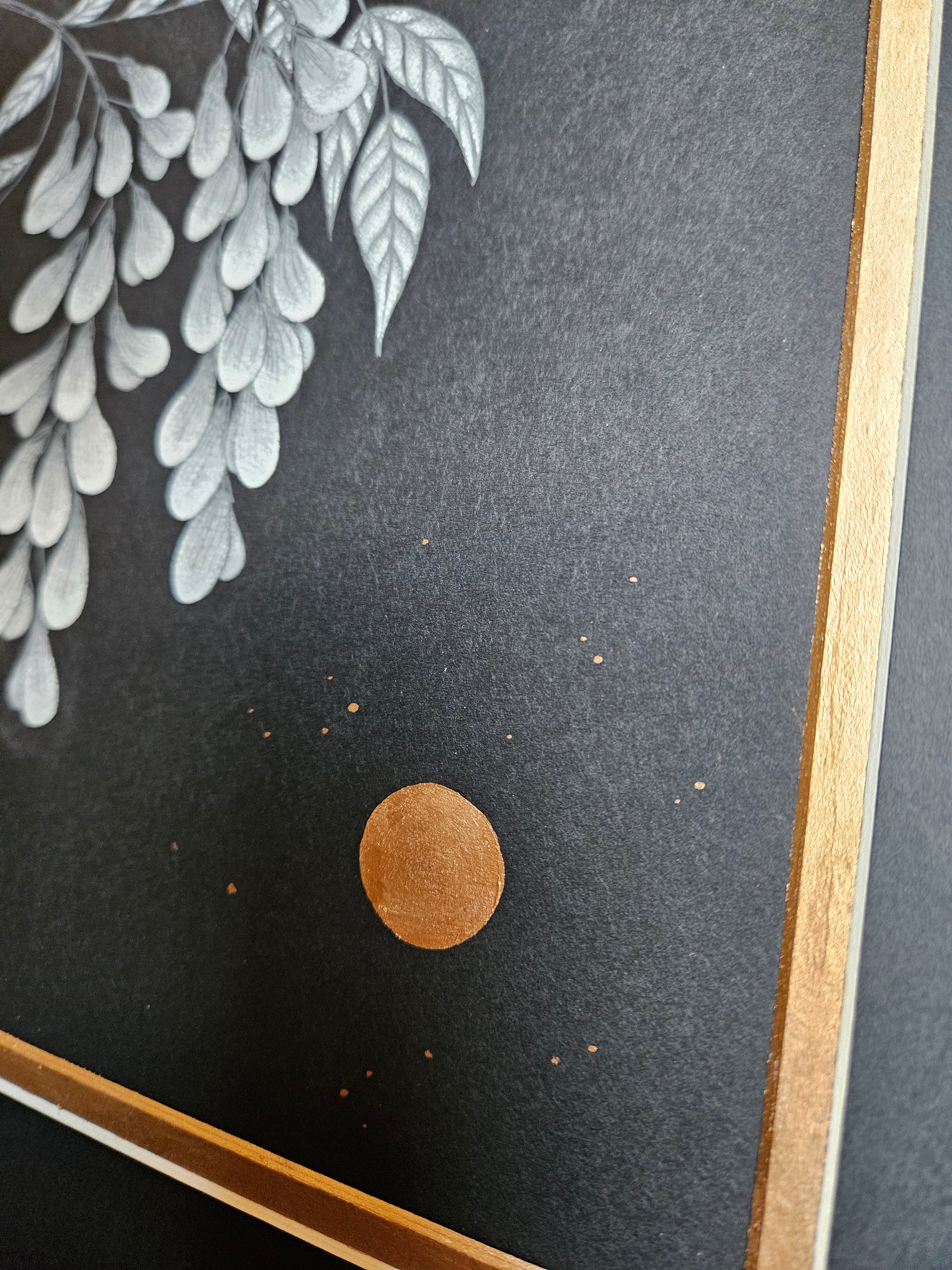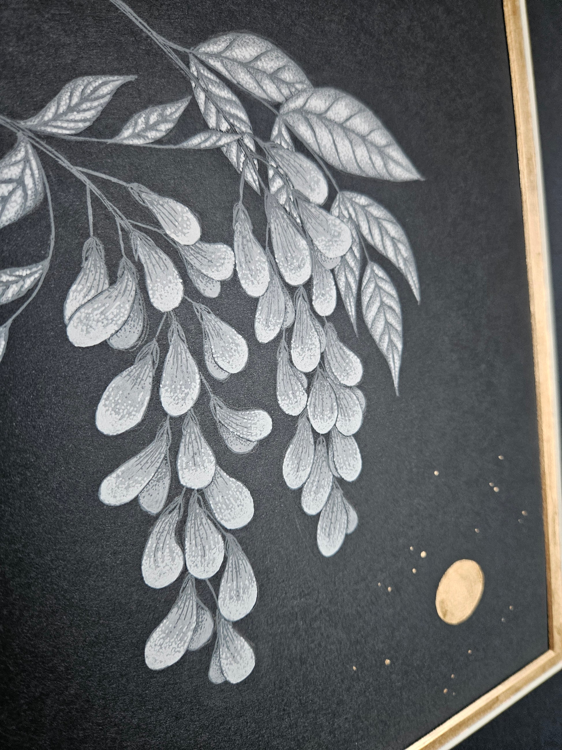 Her subject matter draws from [insert inspiration: “Appalachian folklore,” “celestial symbology,” “personal mythologies,” etc.], rendered in delicate linework that glows against its dark ground. Each drawing is a one-of-a-kind piece that embodies both mystery and refinement.